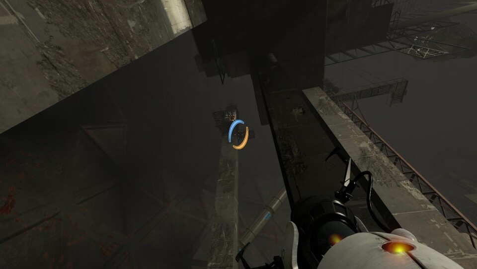 Verlassen Sie den Aufzug und springen Sie von der Metallbrücke auf den Schrott im Wasser. Von dort können Sie über die Metallgerüste den Boden erreichen, von dem die großen Säulen in den Himmel ragen. An eine der Säulen können Sie ganz oben eine weiße Fläche erkennen, die geradezu nach einem Portal schreit. Von da aus können Sie in die eigentliche Testkammer schauen. Ein Portal später sind Sie drin. Ein Portal kommt auf die leicht erhöhte Plattform. Drücken Sie auf den Schalter, damit Repulsion Gel von der Decke geworfen wird.