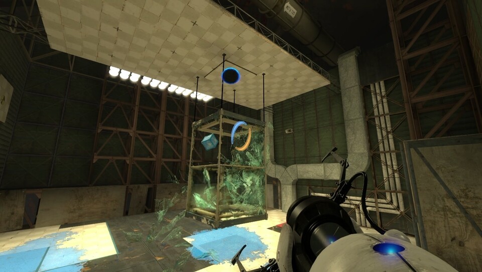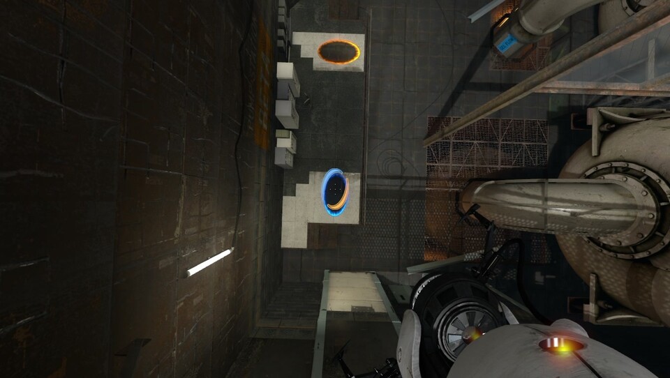Schauen Sie nach links, wenn Sie den Fahrstuhl verlassen und platzieren Sie ein Portal auf der entfernten Wand. Gehen Sie dann in die Halle und platzieren Sie das zweite Portal auf der linken Wand, nachdem Sie einen Knick macht. Im nächsten Raum müssen Sie auf die Metallbrücke ganz oben auf der gegenüberliegenden Wand. Jetzt wird’s ein wenig knifflig: Von oben sollten Sie die Portale auf den beiden weißen Bodenflächen platzieren (Bild), durch das erste durchspringen und dann in der Luft das gleiche Portal an die weiße Fläche hoch oben neben der durchsichtigen Trennwand setzen.