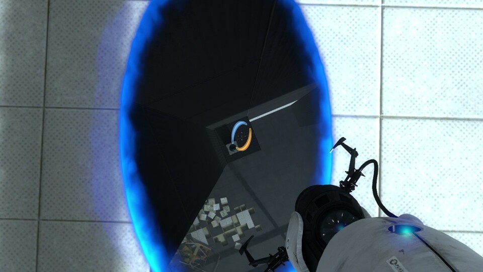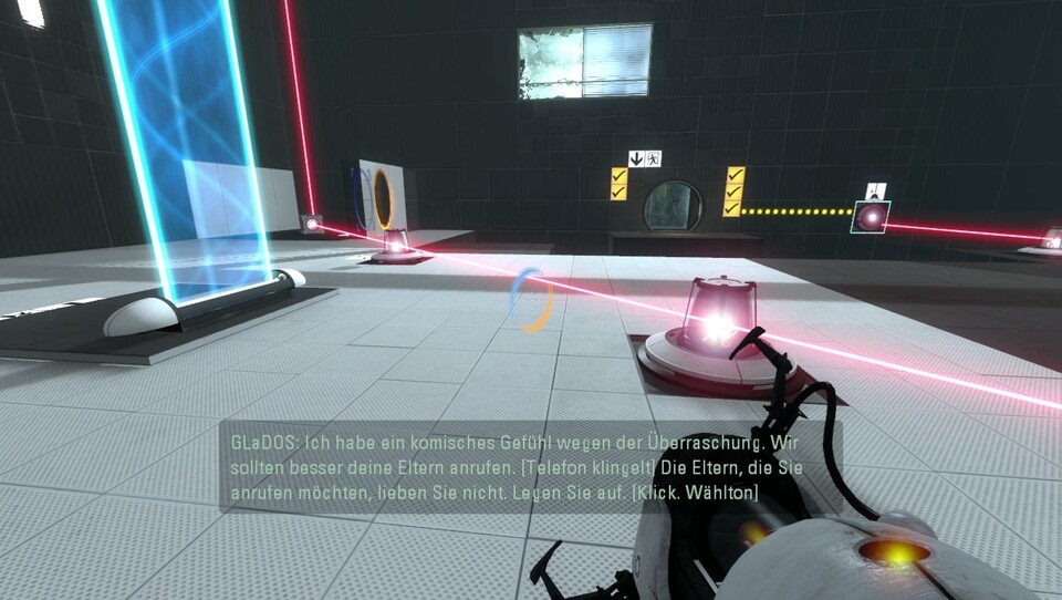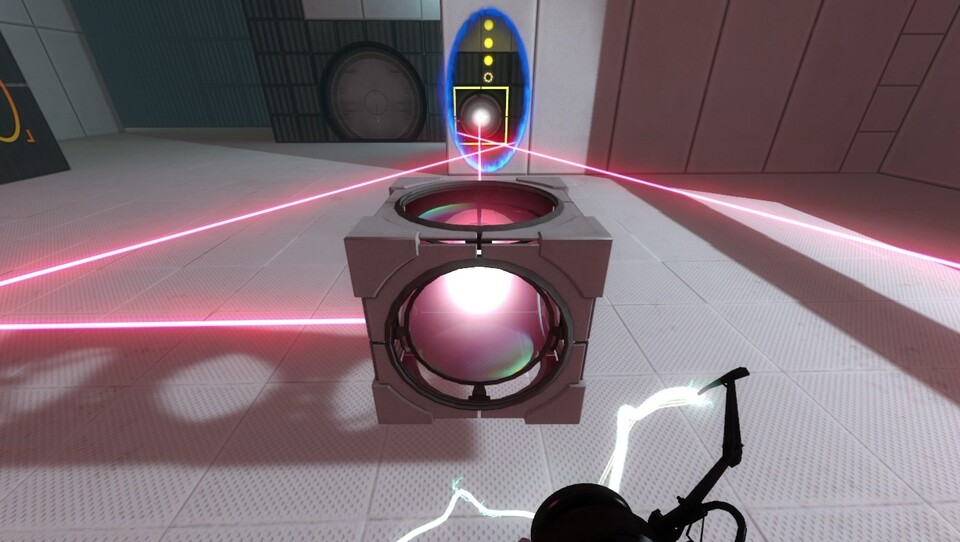 Der Raum wirkt auf den ersten Blick groß und unübersichtlich. Suchen Sie hinter der Wand Deckung und schießen Sie ein Portal auf die gegenüberliegende Seite. Leiten Sie die Lichtbrücke von dort so um, dass sich eine Barriere auf der linken Seite bildet. Drücken Sie nun auf den Knopf, werden zwei spiegelnde Würfel auf die Ursprungsseite des Raumes geschleudert. Mit einem dieser Würfel und den zwei Portalen sollten Sie zuerst den nervigen Geschützturm zerstören. Danach können Sie beide Würfel so anordnen, dass alle Bodenspiegel vom Laser berührt werden. Die Tür erreichen Sie, indem Sie die Lichtbrücke mit den Portalen umleiten.