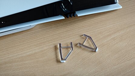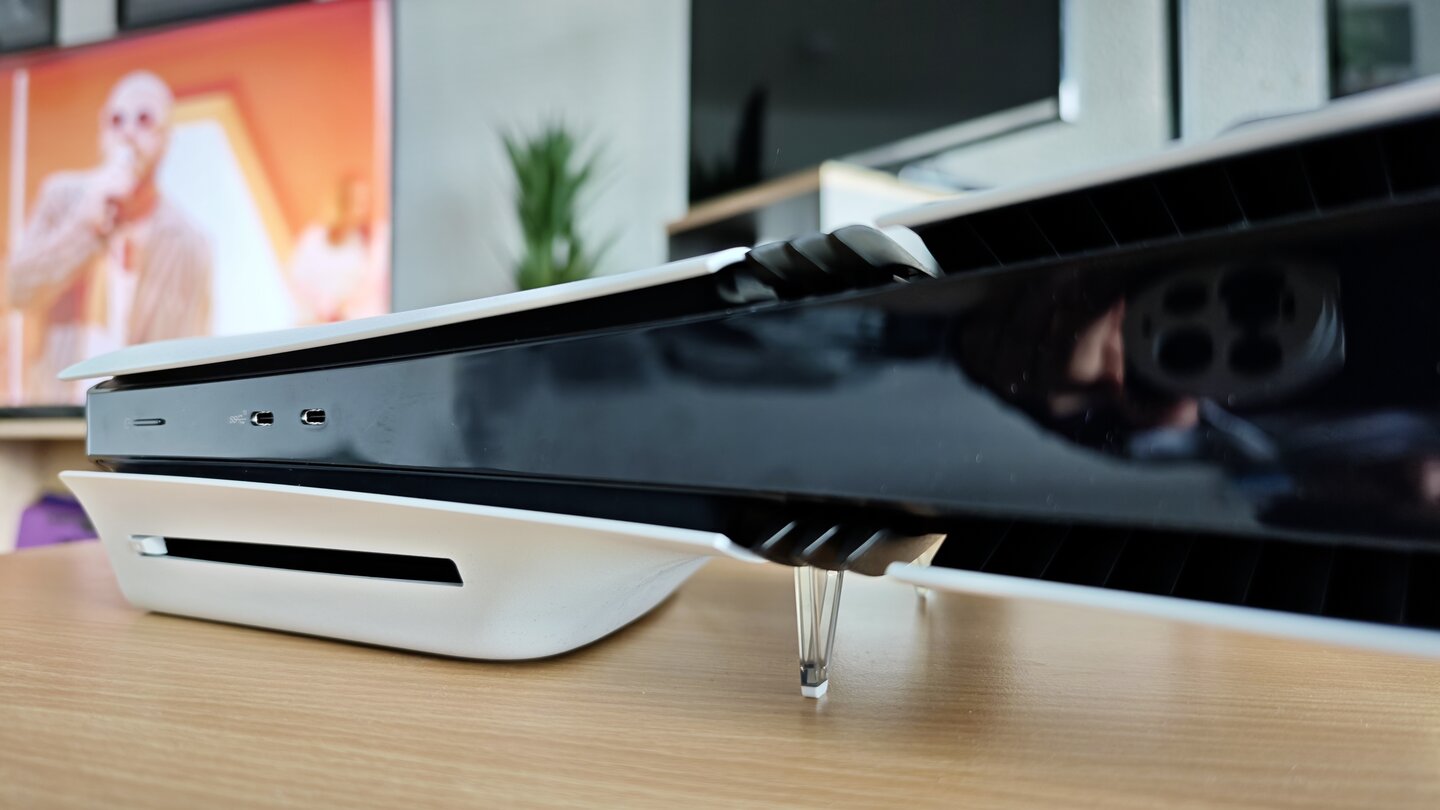 Stellt ihr die PS5 Pro ohne die Kunststoff-Clips seitlich auf, liegt sie nicht sonderlich stabil und wackelt.