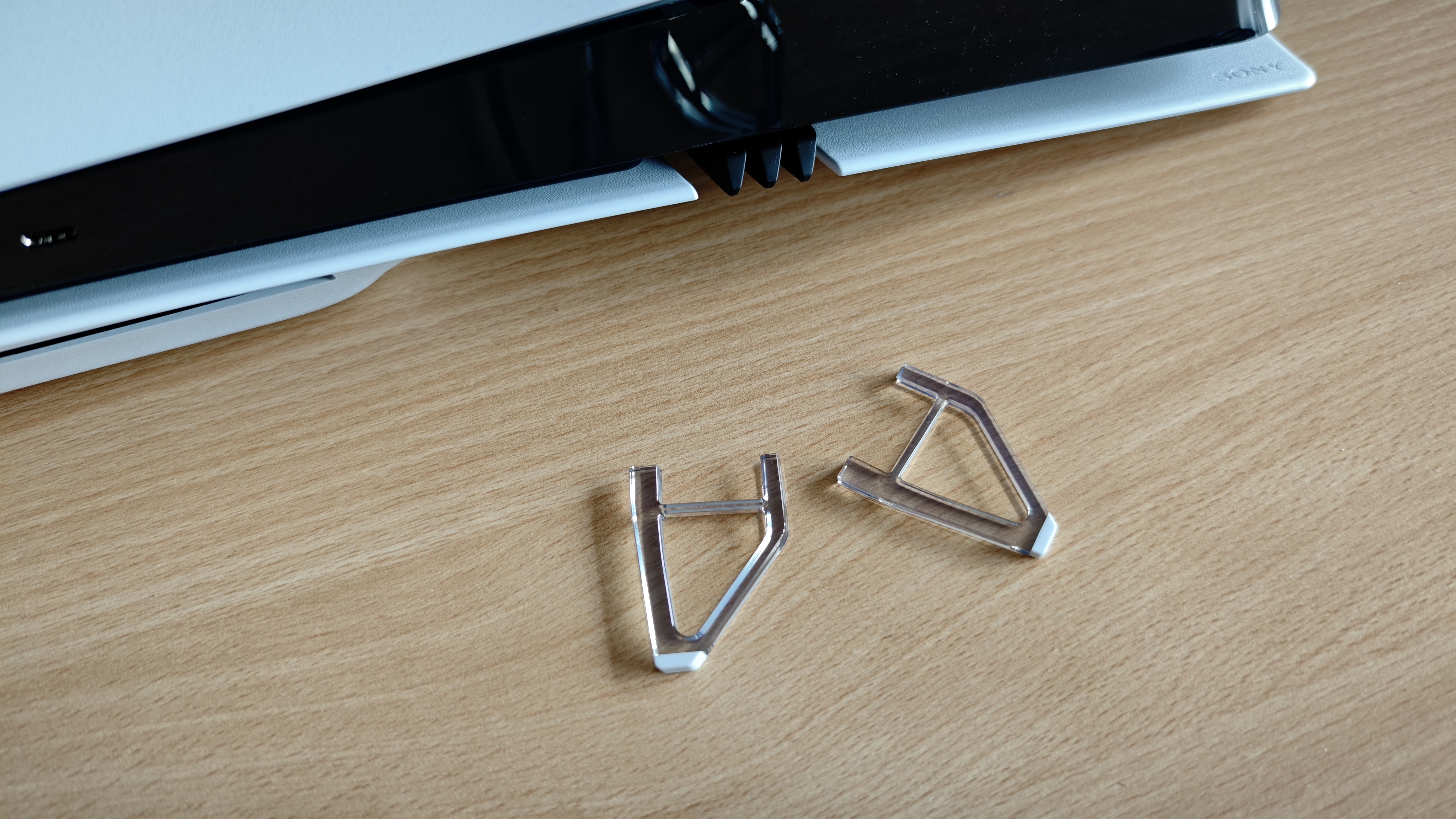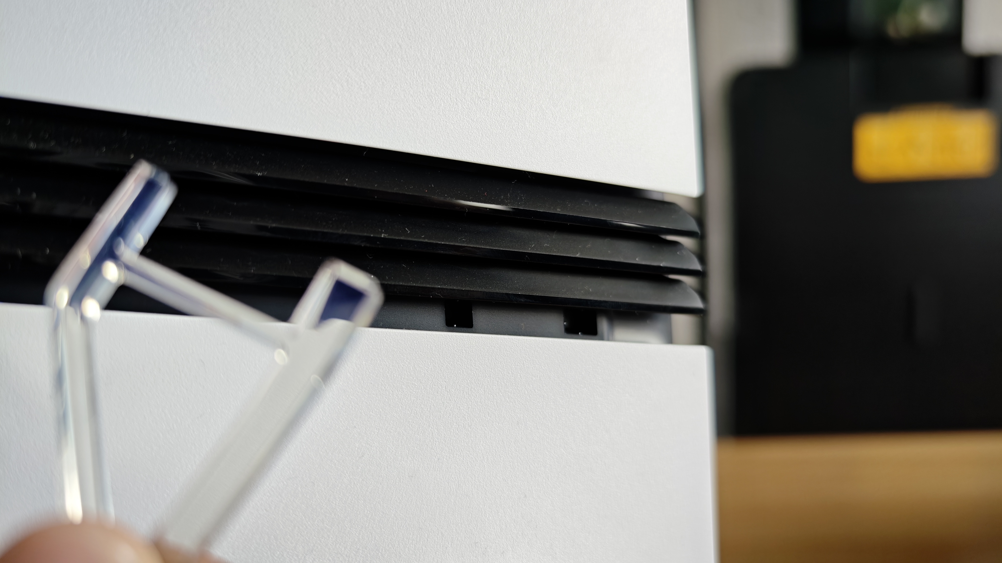 Selbst mit dem Disk-Laufwerk könnt ihr die PS5 Pro horizontal aufstellen, weil angepasste Kunststoff-Clips im Lieferumfang enthalten sind. (Bildquelle: Duy Linh Dinh/GameStar Tech)
