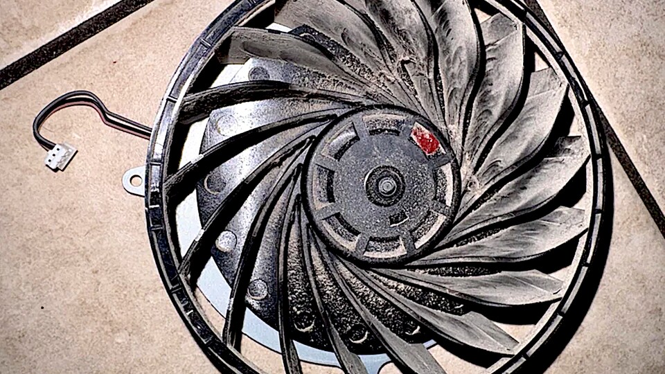 Bei Teardown der PS5 vom YouTube-Kanal TronicsFix ist ebenfalls ein kleines rotes Auswuchtgewicht zu erkennen. Der Lüfter der PS5 Slim sieht dagegen anders aus, wie hier anhand einer Szene aus dem Teardown von Linus Tech Tips zu erkennen ist. Ein positiver oder negativer Ausgleich der Unwucht kann aber auch ohne erkennbares Auswuchtgewicht stattgefunden haben.
