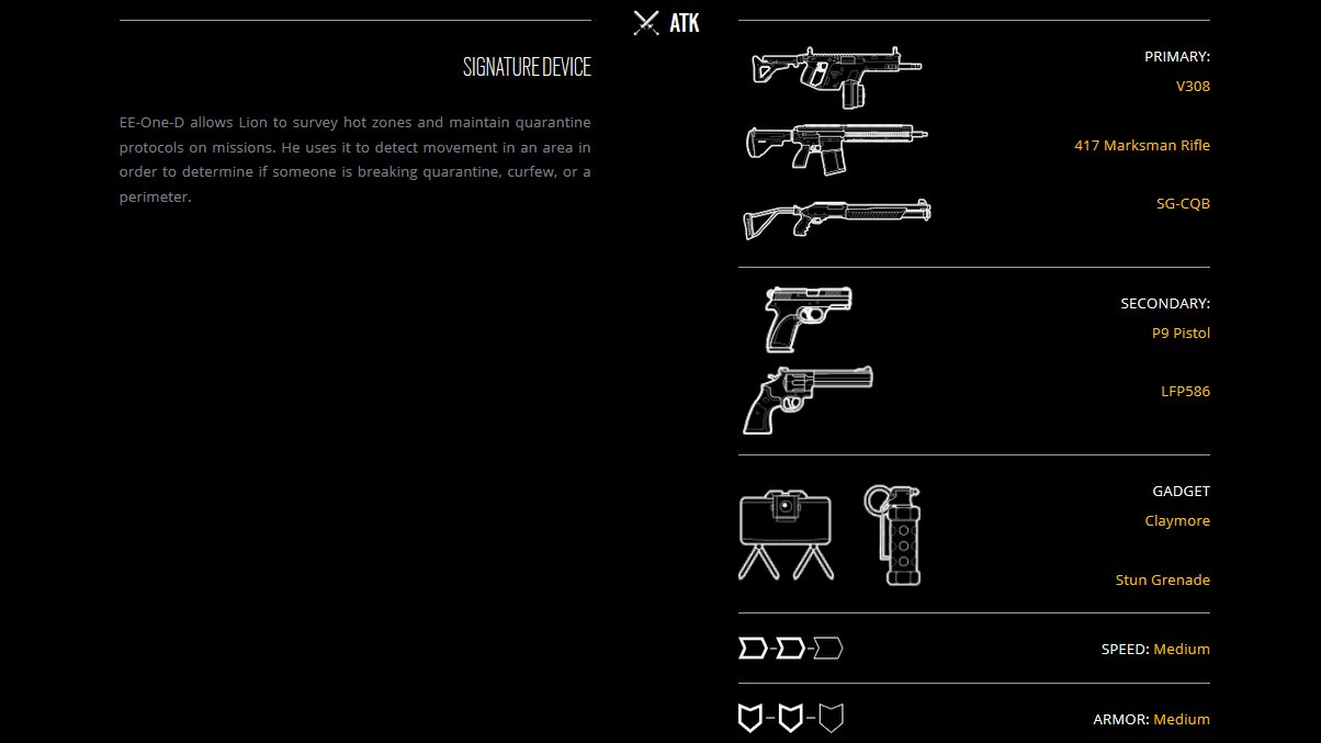 Wie auch Finka hat Lion jeweils zwei Punkte in Geschwindigkeit und Rüstung. Bei seiner Hauptwaffe darf er zwischen der V308, 417 Marksman Rifle und der SG-CQB wählen. Als Sekundärwaffe nutzt er entweder die P9 Pistol oder die LFP586. In Sachen Gadgets hat er die Wahl zwischen einer Claymore und einer Flashbang.