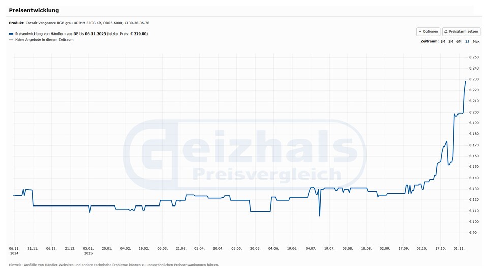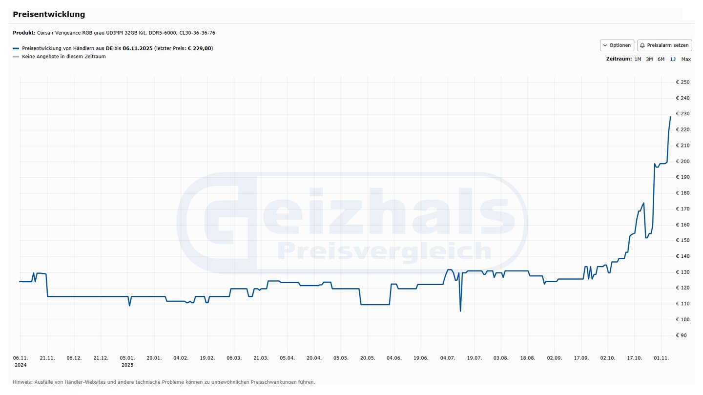 Kein Wunder, wenn man sich beispielhaft die jüngste Preisentwicklung eines beliebten Kits mit insgesamt 32 GByte DDR5-RAM anschaut.