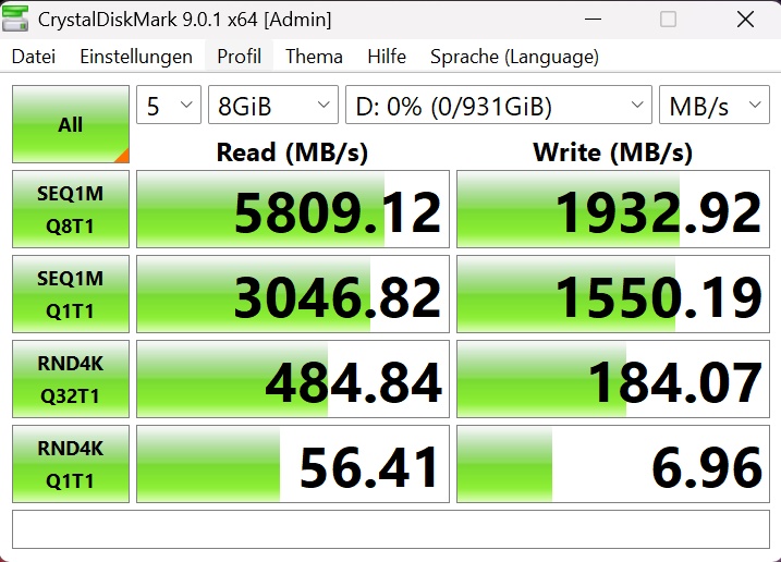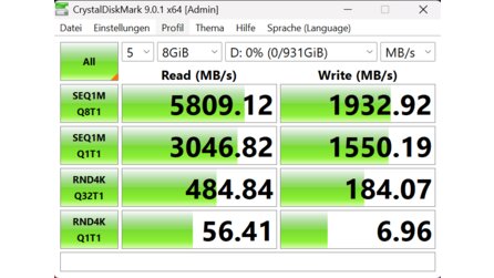Im CrystalDiskMark konnte ich im sequenziellen Lesen 5.809 MB/s ermitteln. Das ist ok, wenn auch nicht überragend, es gibt Thunderbolt 5 SSDs, die deutlich über 6.000 MB/s erreichen.
