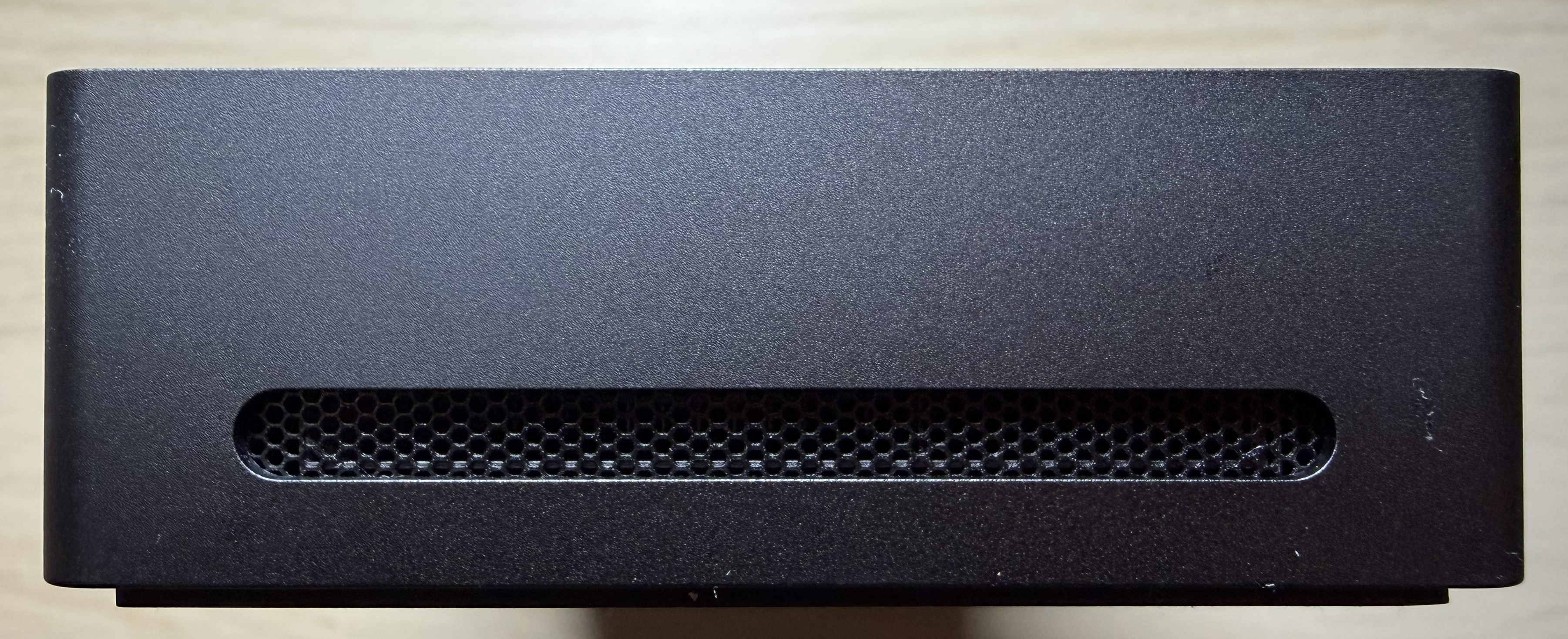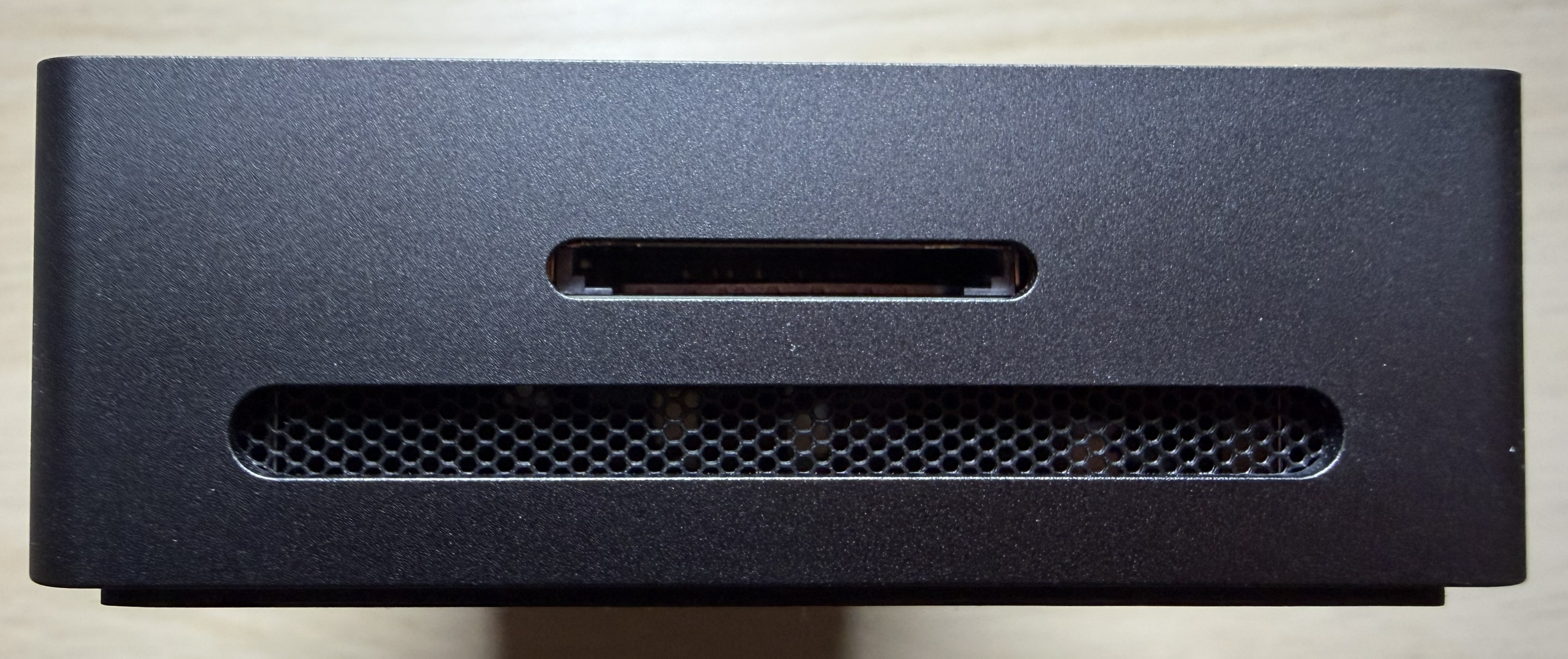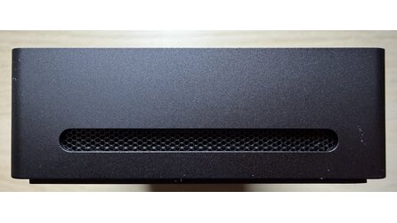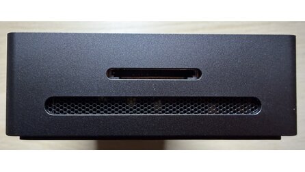 An Front und Oberseite gibt es außer viel Metall nichts zu sehen. An beiden Seiten könnt ihr ein kleines Lüftungsgitter erkennen. Beim Einschalten macht auch ein eingebauter Lüfter kurz auf sich aufmerksam. An der von vorn gesehen rechten Seite befindet sich zudem noch ein Kartenleser.