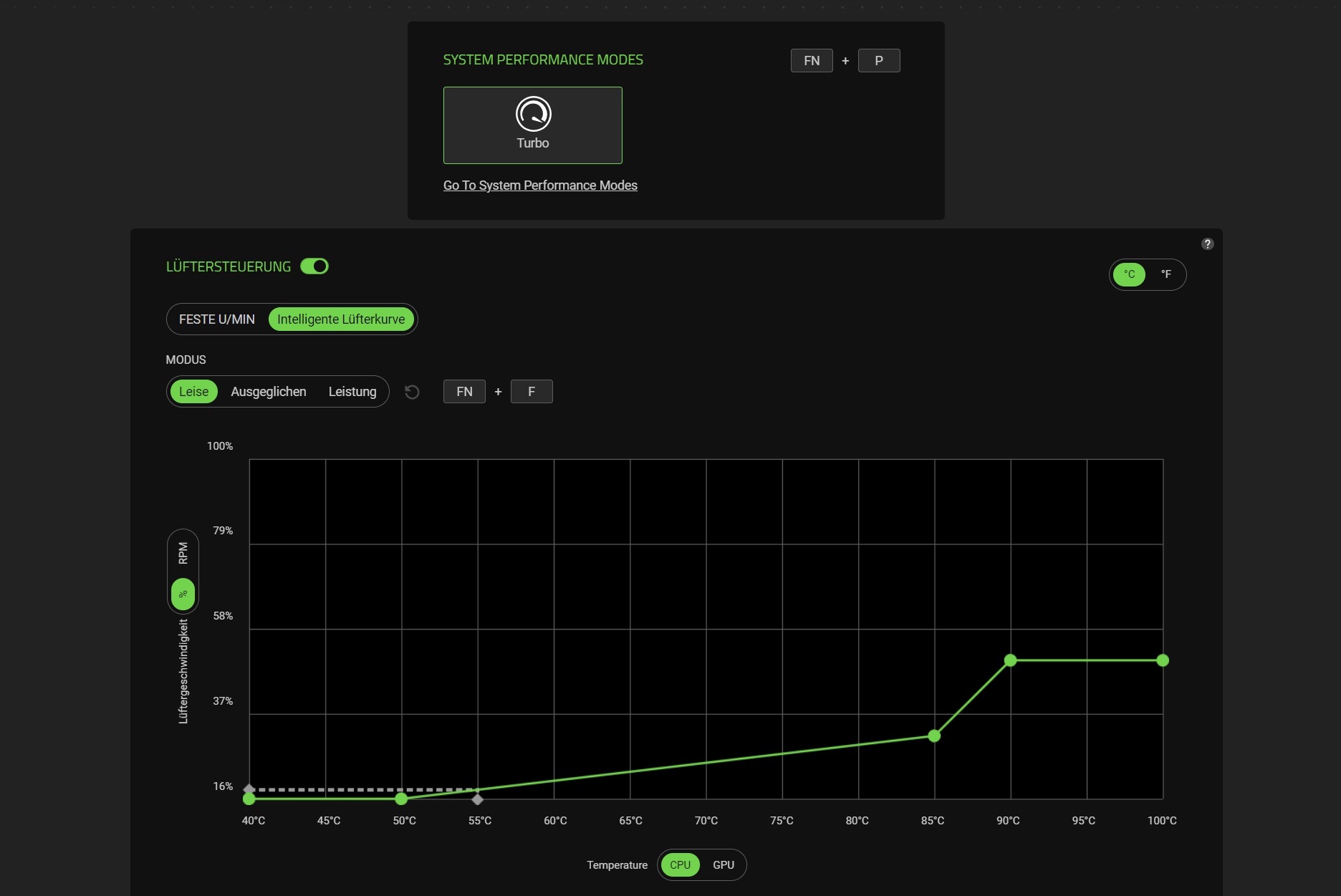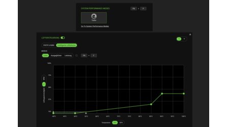 Über Razers Synapse-Software können verschiedene Einstellungen vorgenommen werden. So ist es unter anderem möglich, die Lüfterkurve manuell anzupassen oder die RGB-Beleuchtung zu konfigurieren.