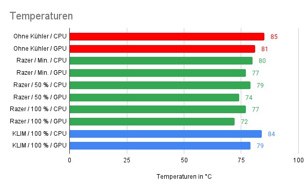 Anders sieht es beim Kühler von Razer aus: In der geringsten Stufe kann das Cooling-Pad die CPU-Temperatur um 5 °C und die Temperatur der GPU um 4 °C reduzieren. Mit einem Lüfter, der mit 100 Prozent läuft, wird der Prozessor auf 77 °C und die Grafikkarte auf 72 °C heruntergekühlt.