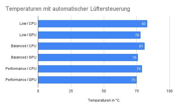 Die Temperatur des Prozessors steigt dabei um rund 10 °C auf 87 °C an. Auch die GPU erwärmt sich um 4 °C, obwohl es hier keine Leistungssteigerung gibt. Die Lautstärke bleibt dagegen auf einem ähnlichen Niveau wie beim Betrieb mit 100-Prozent-Lüftergeschwindigkeit.