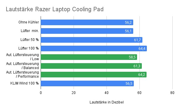 Die Kühlleistung des Razer-Kühlers kann also durchaus überzeugen, das kann man von der Lautstärke allerdings nicht behaupten. Auf der geringsten Stufe ist das Laptop-Cooling-Pad so laut wie das Razer Blade 16 unter Last und der KLIM Wind bei 100 Prozent. Das ist durchaus noch akzeptabel.