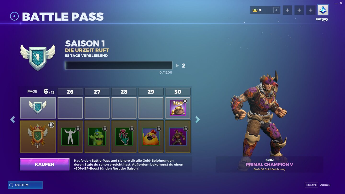 Der erste Battle Pass für Realm Royale hat das Thema Urzeit und liefert entsprechende Skins mit Dinojäger-Geschmack, einen Raptor als Mount oder ein Dino-Ei mit Füßen als Todes-Avatar. Als was? Verzeihung, will meinen: In Realm Royale sterben wir nicht sofort, wenn uns ein Gegner ausschaltet. Stattdessen laufen wir in der Vanilla-Fassung als gackerndes Huhn durch die Gegend, das wieder zum vollwertigen Kämpfer wird, wenn unser Gegner ihm nicht zeitnah den Garaus macht. Diesen witzigen Avatar kann man in Realm Royale durch verschiedene Todes-Avatare ersetzen, im Battle Pass könnt ihr eben ein Dino-Ei mit Füßen freischalten.