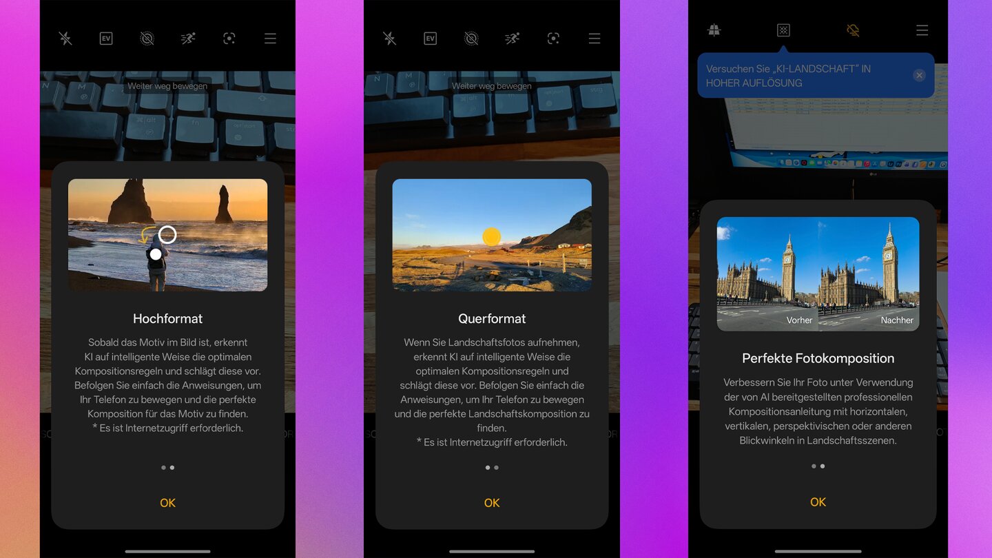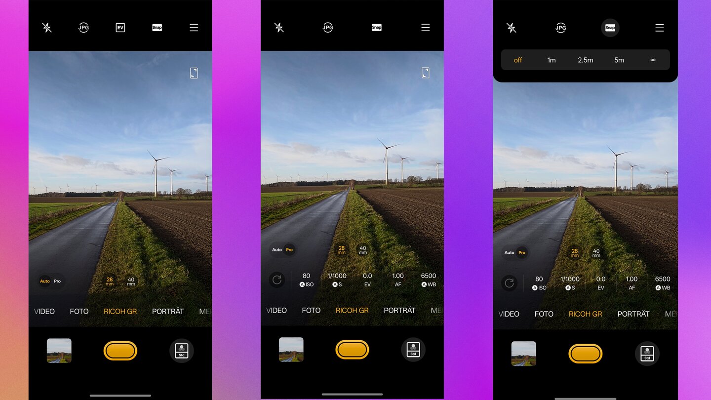 In der Praxis ist der Ricoh-Modus ein Nice-to-Have, wenn ihr gerne Street-Fotografie macht. Für normale Nutzer reicht die reguläre Kamera-App mit ihren zahlreichen Zoom-Stufen vollkommen aus. Auch hier habt ihr zahlreiche Einstellungsmöglichkeiten sowie zusätzliche KI-Funktionen für den optimalen Bildausschnitt, Verbesserung von Landschaftsaufnahmen und einiges mehr.