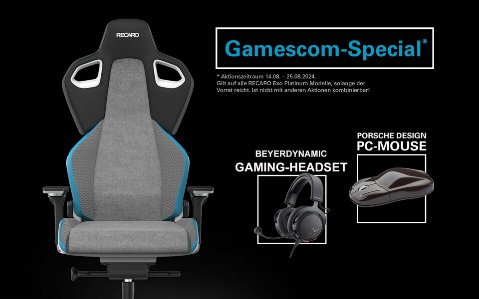 Holt euch hier den RECARO Exo Platinum samt Goodie-Bag!Der RECARO Exo Platinum ist dabei das Top-Modell und passend zur gamescom 2024 bekommt ihr den Premium-Stuhl zusammen mit einem Goodie-Bag im Wert von über 150 Euro. Das besondere Bundle enthält eine Porsche-Maus und ein Gaming-Headset von beyerdynamic.