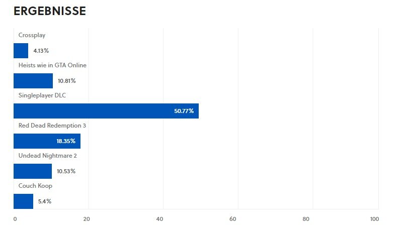 Etwa die Hälfte aller Umfrageteilnehmer wünschen sich einen Singleplayer-DLC, nur werden sie den vermutlich nie bekommen. Ende September 2019 gab Rockstars Lead Online Production Associate Katie Pica in einem Interview mit VG24/7 bekannt dass sich aktuell voll und ganz auf Red Dead Online konzentrieren: