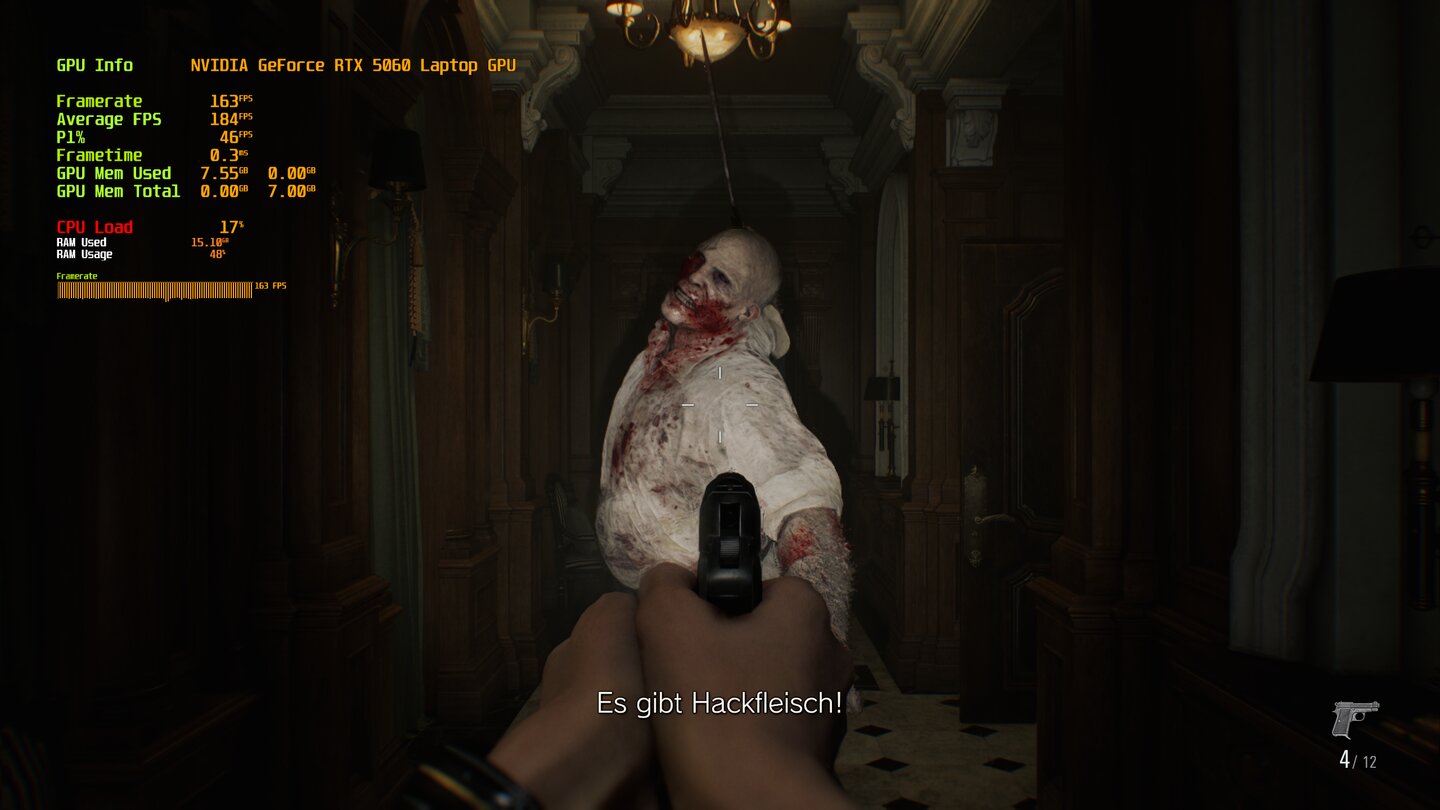 Schon nativ knackt das System auf mittleren Details locker die 60-FPS-Marke (und das sogar mit aktiviertem Raytracing!). Da der Performance-Unterschied zu niedrigen Einstellungen minimal ist, bietet „Mittel“ hier den perfekten Sweetspot. Das unterstreicht sowohl die Rohleistung der RTX 5070 als auch die gute Optimierung, die Capcom bei Resident Evil 9 abgeliefert hat.