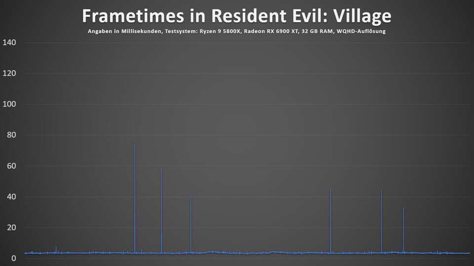 Wie die Diagramme zeigen, gibt es immer wieder einzelne Ausreißer nach oben, die sich beim Spielen in einem kurzen Stocken bemerkbar machen. Das zweite Testsystem mit niedrigerer Auflösung ist davon etwas weniger stark betroffen, aber auch hier sind die Probleme vorhanden.