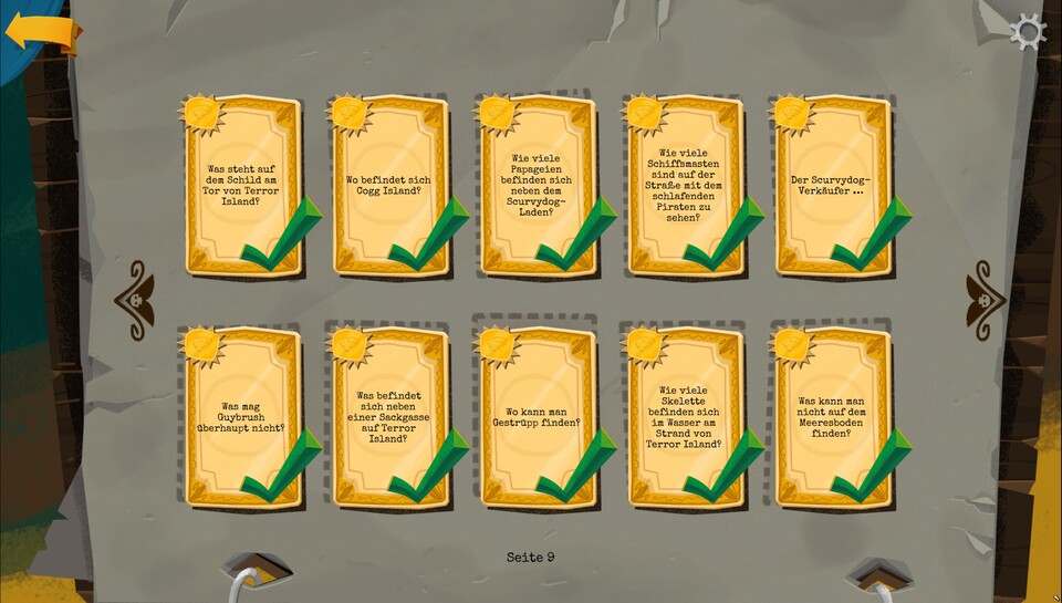| S9 | 9 | Wie viele Skelette befinden sich im Wasser am Strand von Terror Island? | Zwei |