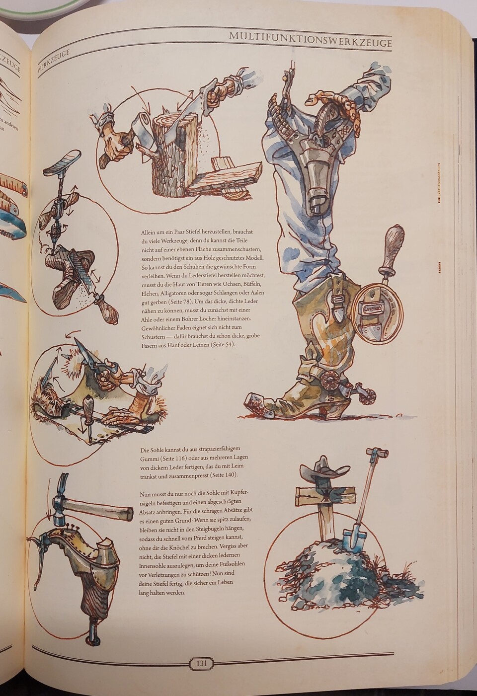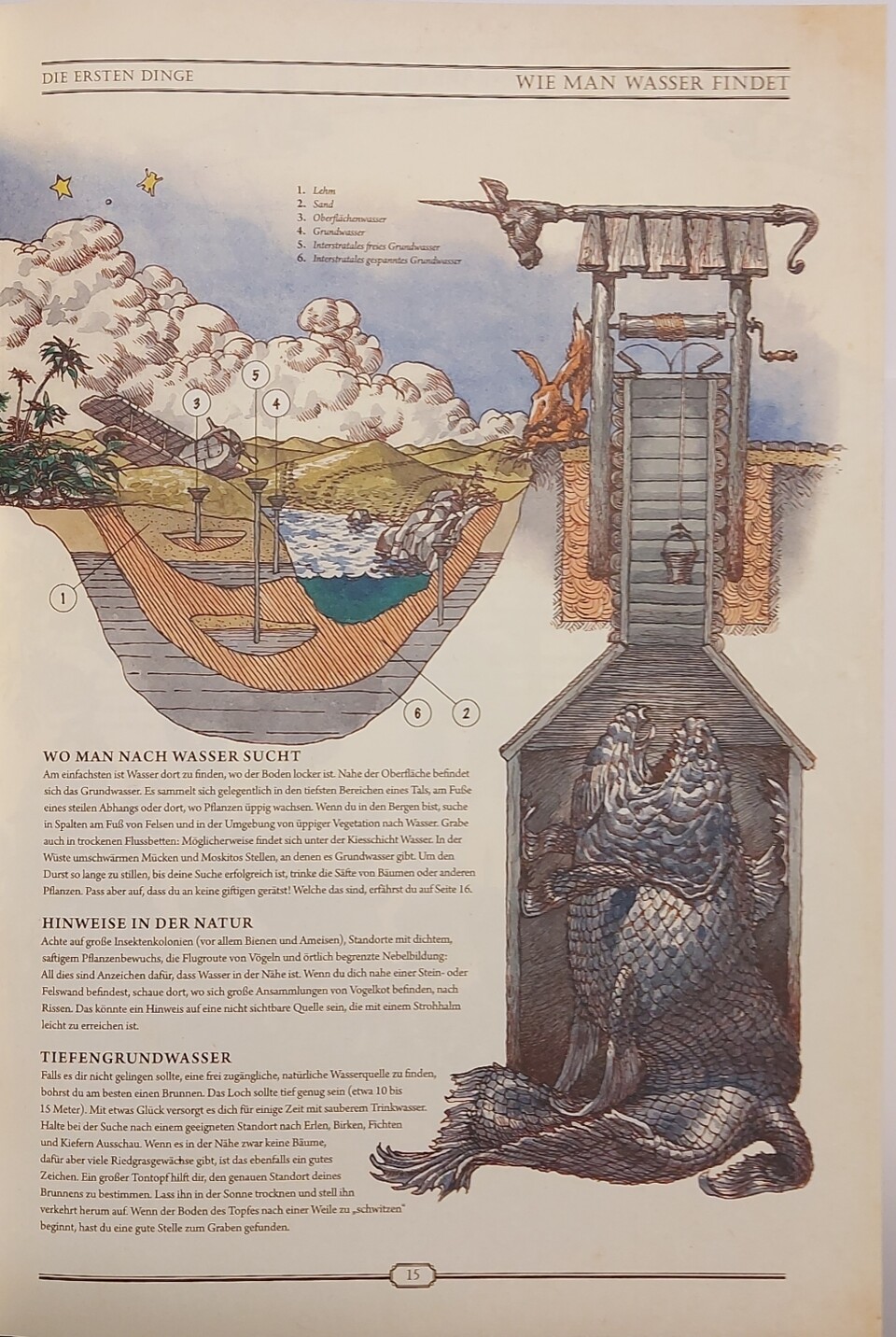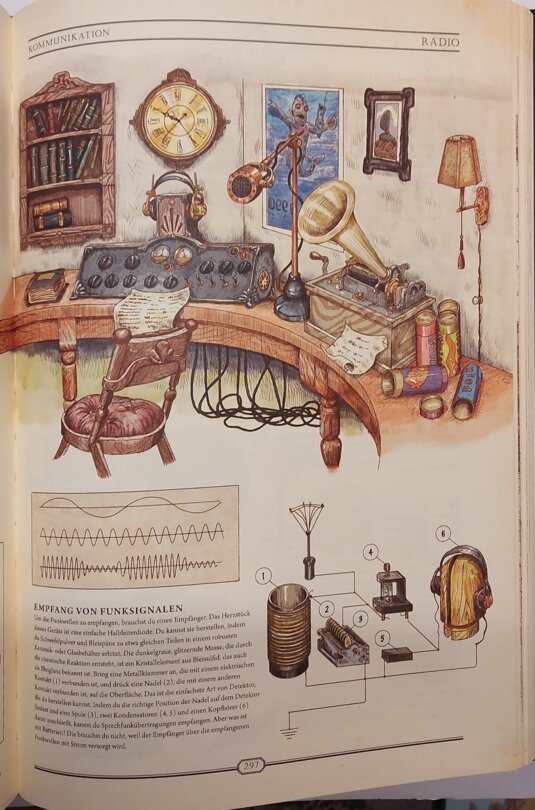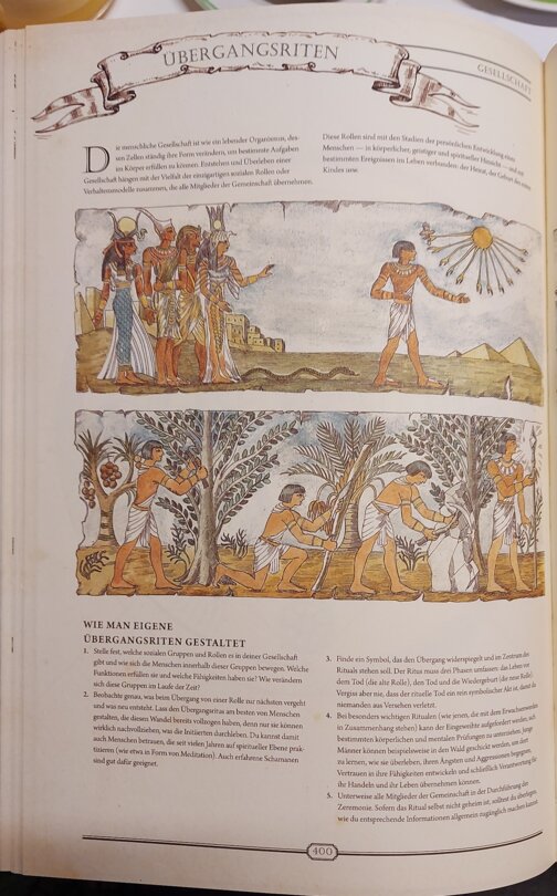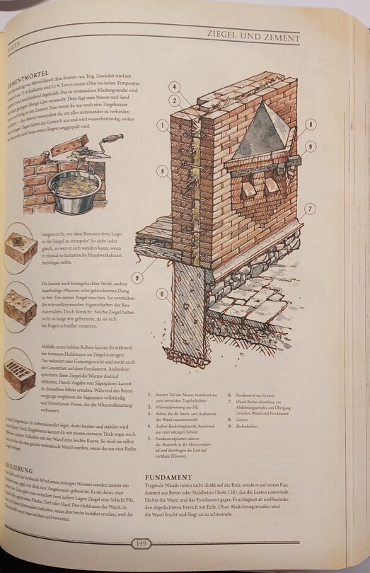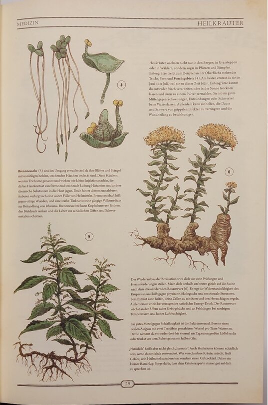 Warten hier goldene Buchstaben auf mit Stoff durchwebten Seiten auf mich? Beim Aufschlagen zerschlägt sich dieser, zugegeben dekadente, Gedanke rasch, doch es bleibt ein Gefühl, hier mehr als ein bloßes Lexikon in Händen zu halten. Die Themenpalette erweist sich erwartungsgemäß als breit: angefangen von grundlegendem Überleben und Naturmedizin, über erste Werkstoffe, Werkzeuge, Lebensmittel und Vehikel bis hin zu Dampfmaschinen, Ölraffination, Spiele, Musik oder Meditation.