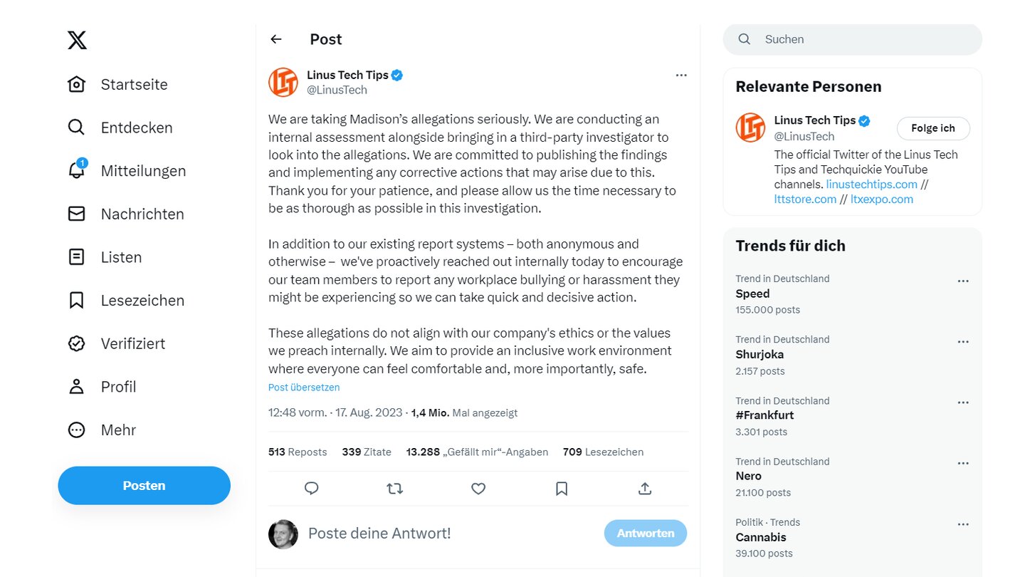 Gleichzeitig gibt es auf X (ehemals Twitter) mittlerweile teils schwere Vorwürfe der ehemaligen Mitarbeiterin Madison Reeve. Im oben zu sehenden Video sind sie kein Thema, was nicht verwundert, da die entsprechenden X-Beiträge erst vor recht kurzer Zeit veröffentlicht wurden.