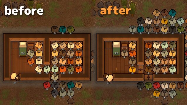 Die Fußmatten aus diesem Mod können aus Leder und Stoff hergestellt werden und reinigen Kolonisten von Dreck, sobald sie diese überqueren, sodass sich in Innenräumen weniger Dreck sammelt (und die Kolonisten nicht dauernd putzen müssen!).