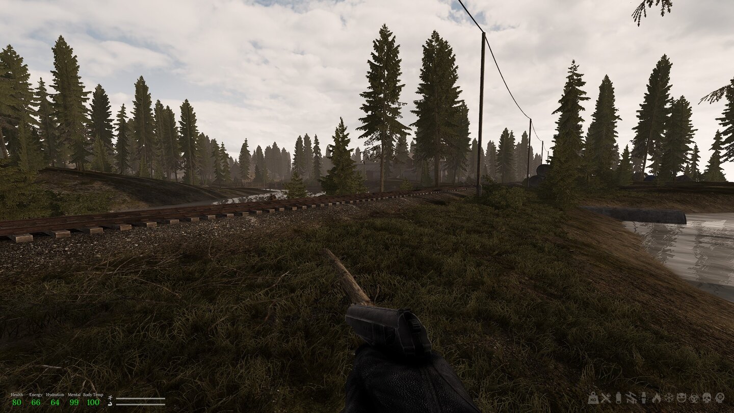 So etwas bin ich aber schon von DayZ und anderen Shootern mit Realismusanspruch gewohnt und starte deshalb optimistisch meinen ersten Ausflug. Begrüßt werde ich von einer von Nadelbäumen geprägten Landschaft, bei der die Sättigung ganz runtergedreht wurde. Alles wirkt grau und düster, was aber hervorragend zum Setting passt.