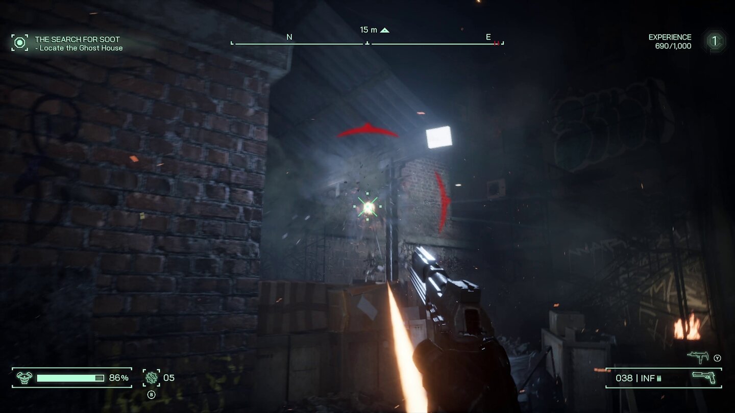 Das Waffen-Feedback ist gut, dank spratzender Bluteffekte und vieler herumstehender Explosivgegenstände. In heruntergekommenen Wohngebäuden und illegalen Autogaragen fliegt allerlei Gerümpel durch die Luft, während großkalibrige Maschinengewehre und RoboCops bewährter Colt den Putz von den Wänden watzen.