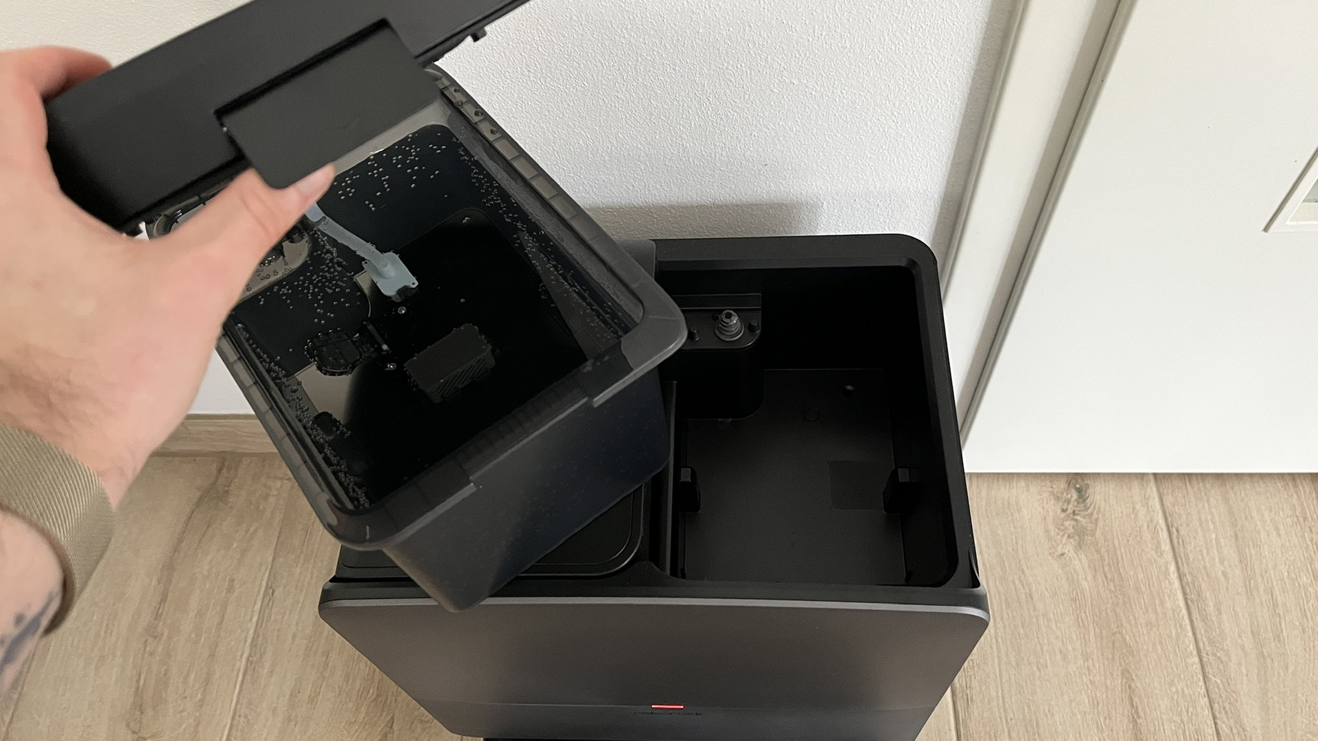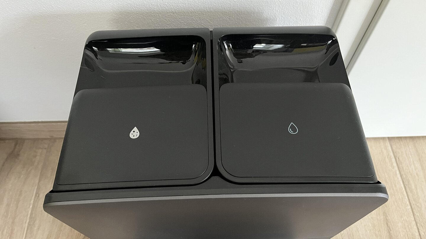 Die Station wirkt dank der dunkel-schimmernden Blende hochwertig, ist ansonsten aber funktional gebaut: Mit einem Griff habt ihr sofort die Wassertanks herausgeholt, ohne erst einen Deckel öffnen zu müssen.