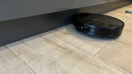 Kanten und Eckenreinigung: Dank der ausfahrbaren Seitenbürste kommt der Roboter sehr gut in Ecken. Aber: Da er die Seitenbürste konstruktionsbedingt nicht anheben kann, neigt er dazu, groben Schmutz (wie Katzenstreu oder Haferflocken) an Kanten eher wegzuschleudern als einzusaugen. Das trübt den sonst perfekten Eindruck etwas.