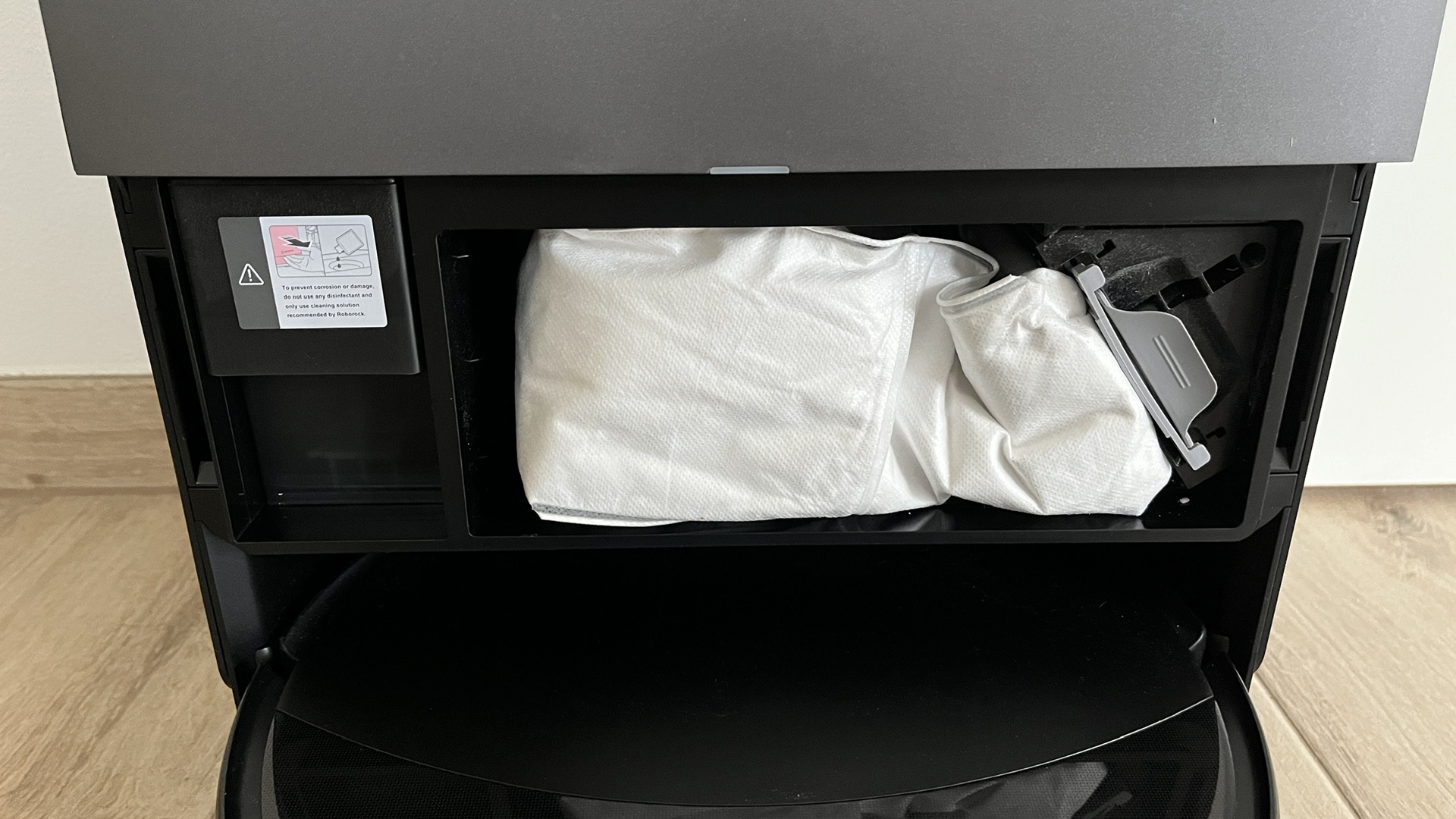 Die Blende lässt sich leicht abnehmen und gibt den Blick ins Innere frei, wo Staubbeutel und Reinigungskartusche Platz finden. Der Einweg-Staubbeutel fasst 2,5 Liter und dürfte je nach Staubansammlung zwei bis drei Monate halten. Danach muss er ersetzt werden.