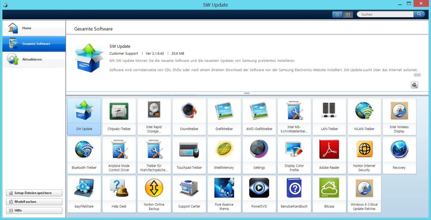 Zu guter Letzt bringen die Samsung-Notebooks auch noch die App SW Update, mit der sich alle Samsung-Applikationen unkompliziert auf dem neuesten Stand halten oder nachinstallieren lassen. Eine solche zentrale, automatische Updatemöglichkeit ist im Alltag Gold wert, da andernfalls alle neuen Programmversionen jeweils einzeln gesucht und installiert werden müssten.