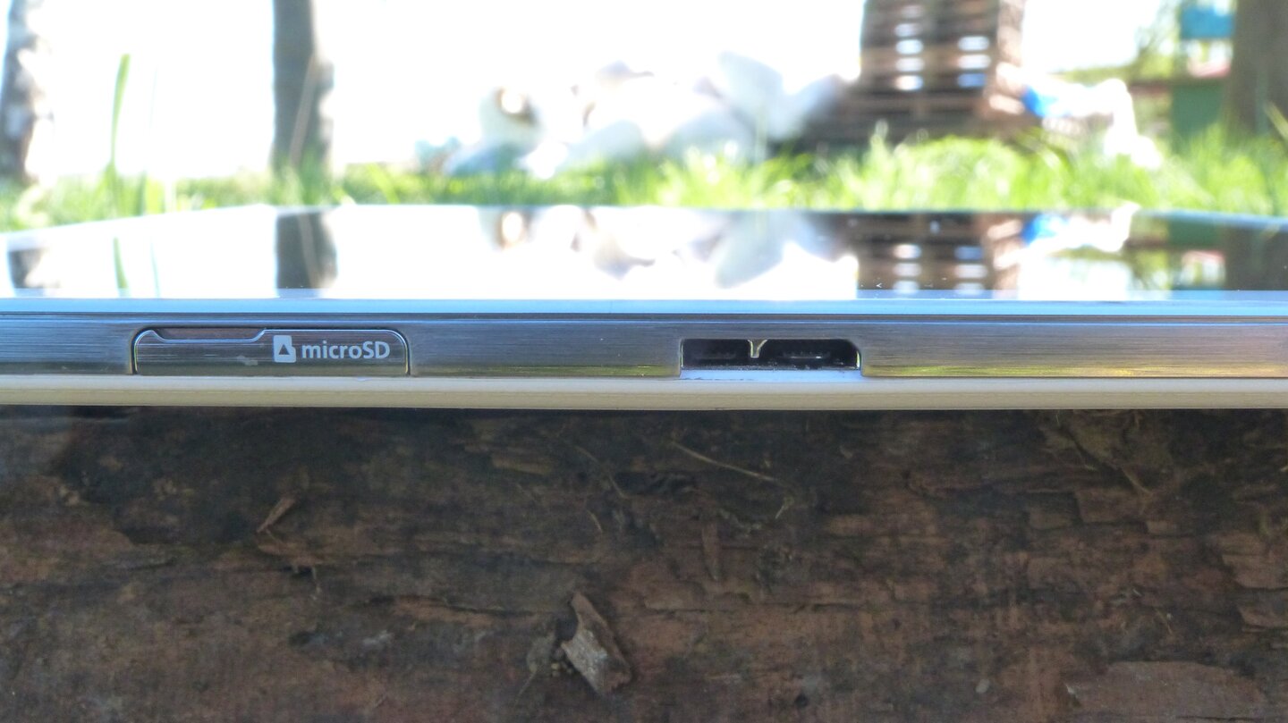 Ungewohnt mutet der Lade- und Datenanschluss des TabPro 12.2 an. Samsung verbaut einen USB 3.0-Port, der sich durch zusätzliche Kontakte von den bekannten Micro-USB-Anschlüssen anderer Tablets und Smartphones unterscheidet. Ein entsprechendes Anschlusskabel sowie ein Netzteiladapter für den USB-Port des Kabels liegt dem Tablet bei. Befürchtungen, auf Reisen müsse nun immer das Samsung-Anschlusskabel mitgeführt werden, sind unbegründet: Der USB 3.0-Port nimmt auch die bekannten Micro-USB-Anschlüsse auf. Das Tablet lässt sich damit sowohl laden als auch mit Daten befüllen - allerdings mit geringerer Geschwindigkeit. Zum Kopieren einer 1,0 Gigabyte großen Datei vom PC auf das Tablet benötigte USB 2.0 etwa 22 Sekunden, mit USB 3.0 waren es nur noch 12 Sekunden für die gleiche Datei.