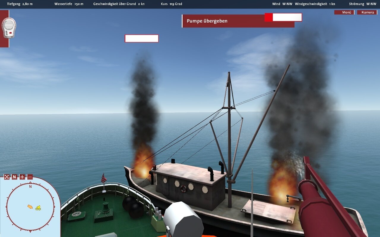 Hat die Verena alle unfreiwilligen Schwimmer herausgefischt, steuern wir das Heck unseres Mutterschiffs an und werden automatisch wieder aufgenommen. Da aber schon genug Müll die See verdreckt, müssen wir die lecke Yacht nun auch noch abschleppen. Dazu wechseln wir in die Ego-Perspektive und gehen an Deck des Retters. Ein Tau wird per Mausklick zum Havaristen geschleudert und dann mit einem weiteren Klick an unseren Pollern festgezurrt.