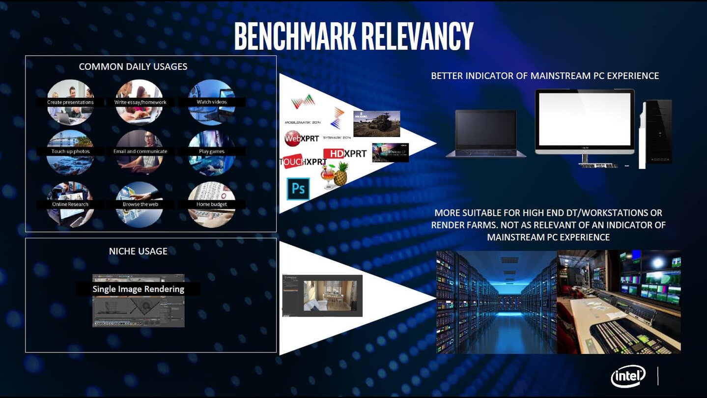 Intel beschreibt dabei zunächst Anwendungen wie Cinebench als »Nische« und wenig relevant, wogegen Dinge wie das Erstellen von Präsentationen, das Surfen im Internet oder auch das Spielen bessere Indikatoren für die Erfahrung der meisten PC-Nutzer darstellen würden.