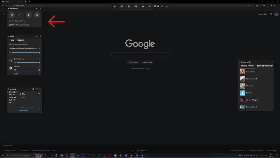 aufrufen. Euer Bildschirm wird abgedunkelt und das Overlay der Game Bar erscheint. Sie bietet euch viele verschiedene Funktionen, wie unter anderem eine Leistungsanzeige, eine Lautstärkeregelung sowie das Aufzeichnen von Bildschirminhalten. In der oberen linken Ecke befinden sich die Tasten hierfür. Sollten diese gerade ausgeblendet sein, könnt ihr sie mit der Toolbar am oberen Rand wieder einblenden.