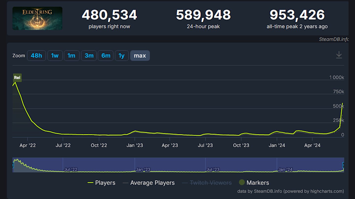 Auch auf Twitch lässt Elden Ring wieder die Muskeln spielen. Zwar ist man auch hier noch ein gutes Stück von den Allzeithochs entfernt, doch in den vergangenen 24 Stunden schauten laut SteamDB knapp 650.000 Interessierte den Streamern ihrer Wahl dabei zu, wie sie die neuen Gebiete erkunden und Bosse vermöbeln.