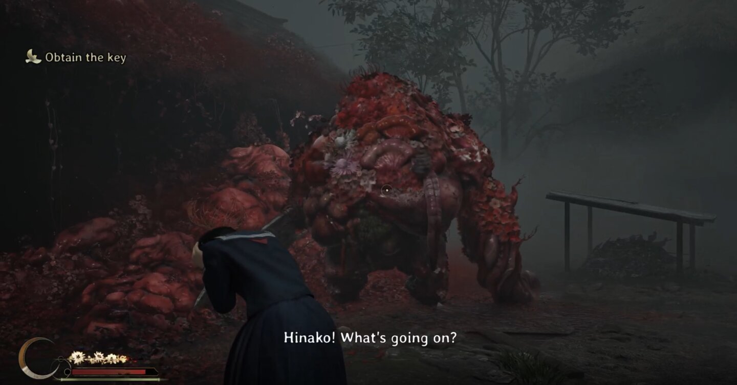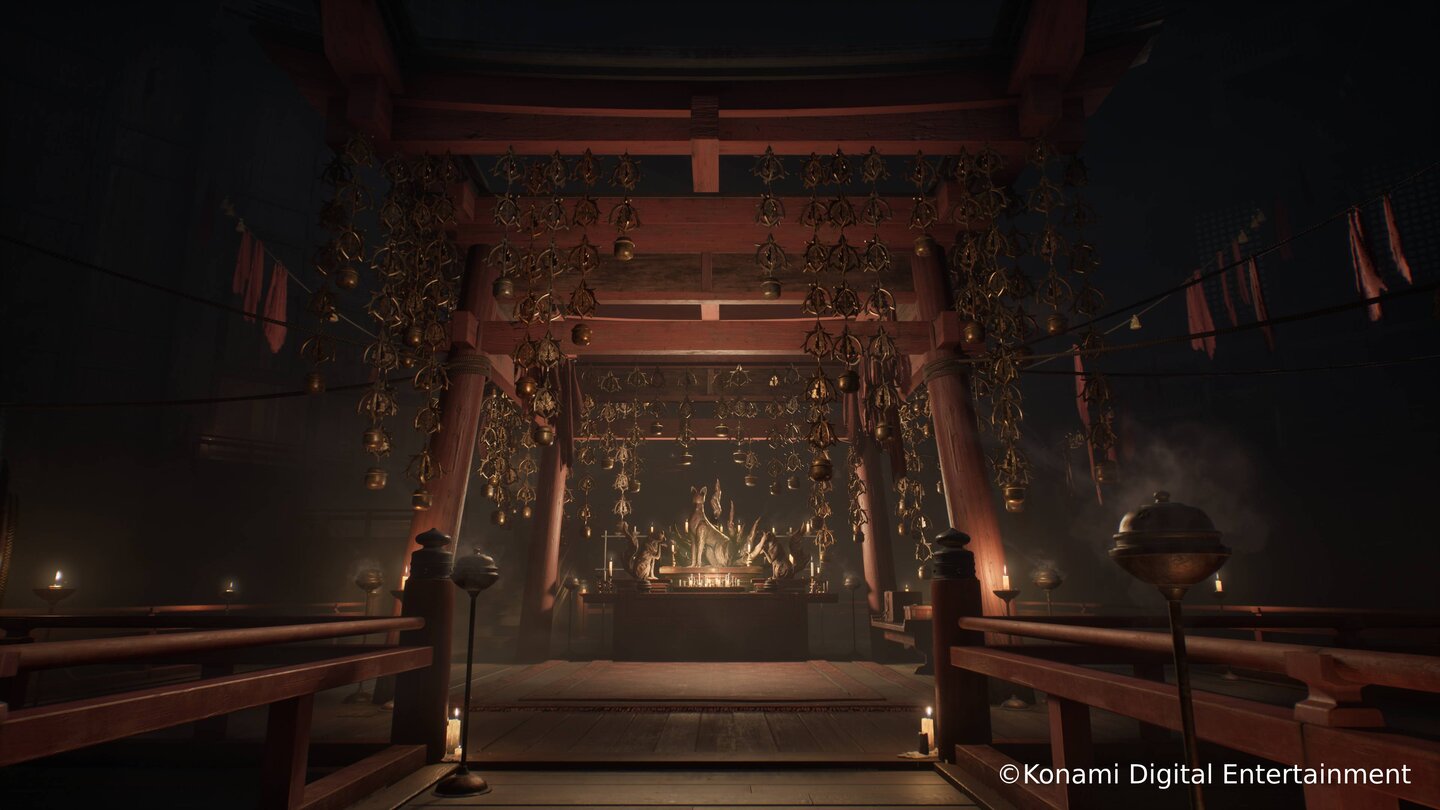 Viele Szenen des neuen Gameplays spielen sich auch auf dem Gelände eines Shinto-Schreins ab. Das erkennt man an den roten Torii, die den Übergang zum heiligen Schrein markieren. Vermutlich handelt es sich hier um eines der ersten Gebiete in der Anderswelt, das wir in Silent Hill f erforschen können – und das mit Hinakos Freundin Sakuko in Verbindung steht.