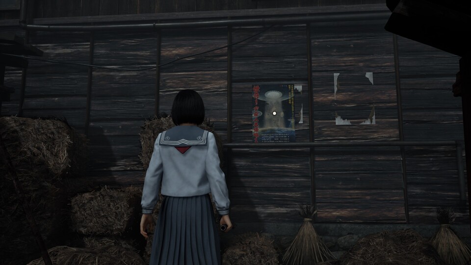 Lauft dafür bis zur östlichsten Scheune und hebt dann die Bretter an, um durch den kleinen Durchgang zu gelangen. An der Wand der Scheune klebt das erste Poster. Wenn ihr alles richtig gemacht habt, sollte jetzt eine kleine Sequenz folgen, in der ihr ein UFO seht.