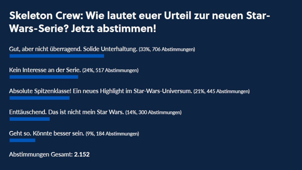 Immerhin halten 33 Prozent (706 Stimmen) von euch Skeleton Crew für solide Unterhaltung. Für 21 Prozent (445 Stimmen) ist die Serie sogar ein echtes Star-Wars-Highlight.