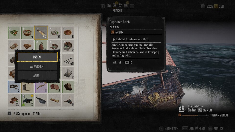 - Packt ausreichend Proviant ein: Essen und Trinken ist ein fantastischer Begleiter für lange Reisen. Gegrillte Speisen (etwa Fisch, Kokusnuss oder Rindfleisch) steigern eure Ausdauerenergie und ihr müsst euer Segeln nicht einziehen, um euch zu erholen. Trinkwasser steigert zudem eure Geschwindigkeit für kurze Zeit. Euer Menü für die Reise könnt ihr auch ganz praktisch auf eure Quickslots packen.