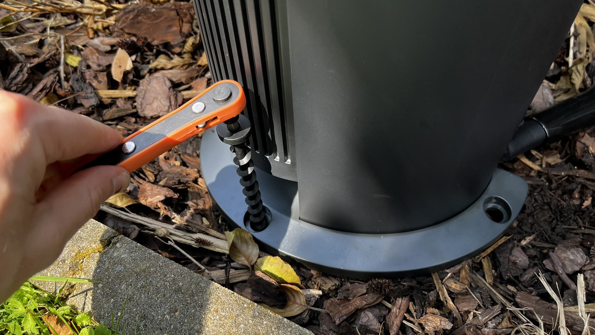 Standfüßchen in den Boden rammen, das Gerät draufsetzen und anschließend mit vier langen Plastikschrauben im Boden fixieren: Die Installation ist das beiliegender Ratsche sehr schnell erledigt.
