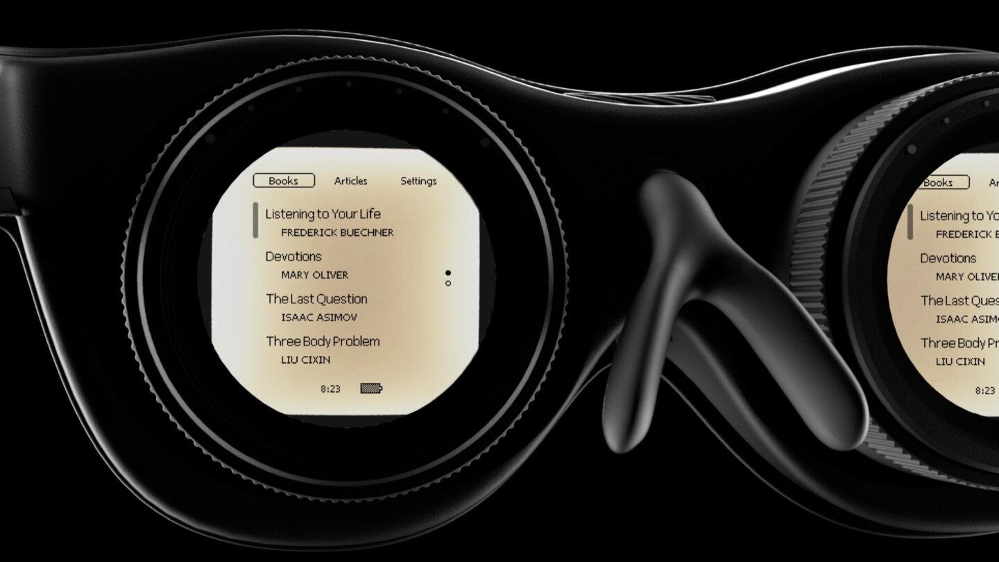 In den Gläsern der Brille sitzt jeweils ein E-Ink-Panel von 1,3 Zoll Größe, das mit 256 x 256 Pixel auflöst. Das soll ausreichen, um bequem zu lesen. Helligkeit und Beleuchtung lassen sich ebenfalls individuell einstellen.