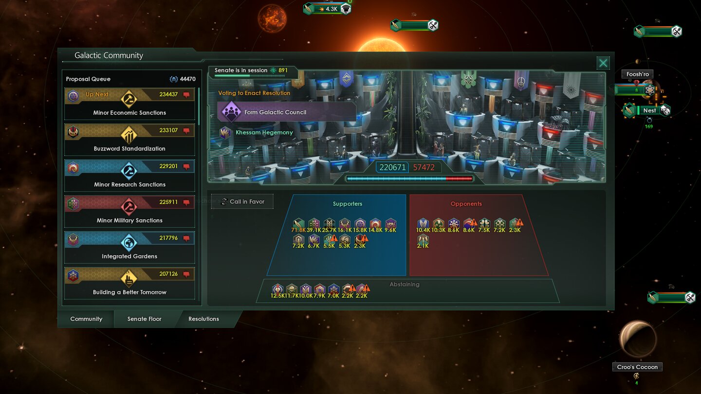 Diese Gefallen kann ich dann einlösen, um Pro-Stimmen für den Galaktischen Rat zu sammeln und dafür zu sorgen, dass schnell darüber abgestimmt wird. Denn nur die Resolution mit den meisten Befürwortern kommt überhaupt zur Abstimmung. Das bereichert das Spiel um eine interessante Komponente, wirklich wichtig war es für mich aber auch nur dieses eine Mal.