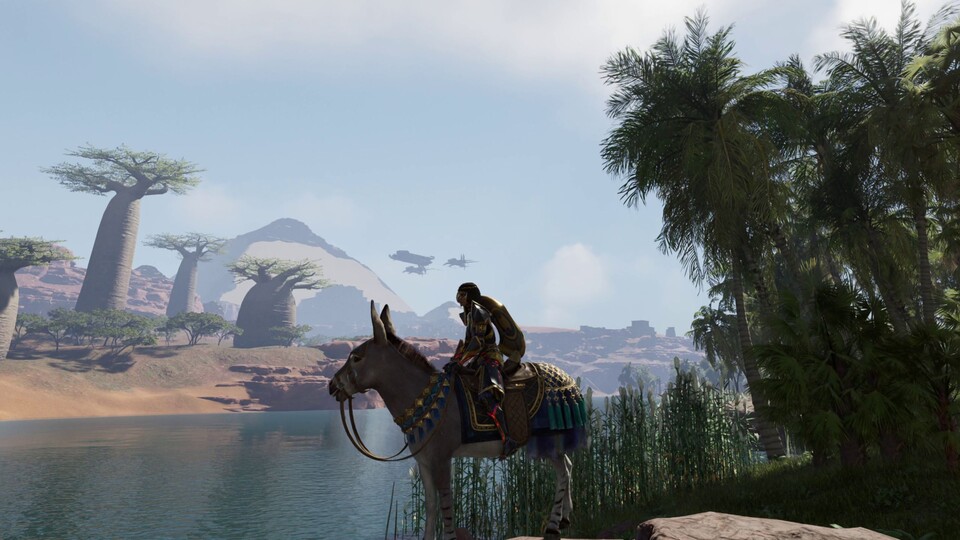 Die erste davon, die Himmelsschwingen-Maske, gibt’s beim Betreten des neuen Gebiets automatisch, und sie ist sehr nützlich. Dank der Macht des Falkengottes Horus wachsen euch nämlich goldene Flügel mit denen ihr mühelos durch die Lüfte saust. Ideal, um im Kampf von oben Pfeile regnen zu lassen oder wie ein Komet auf Feinde herabzustürzen.