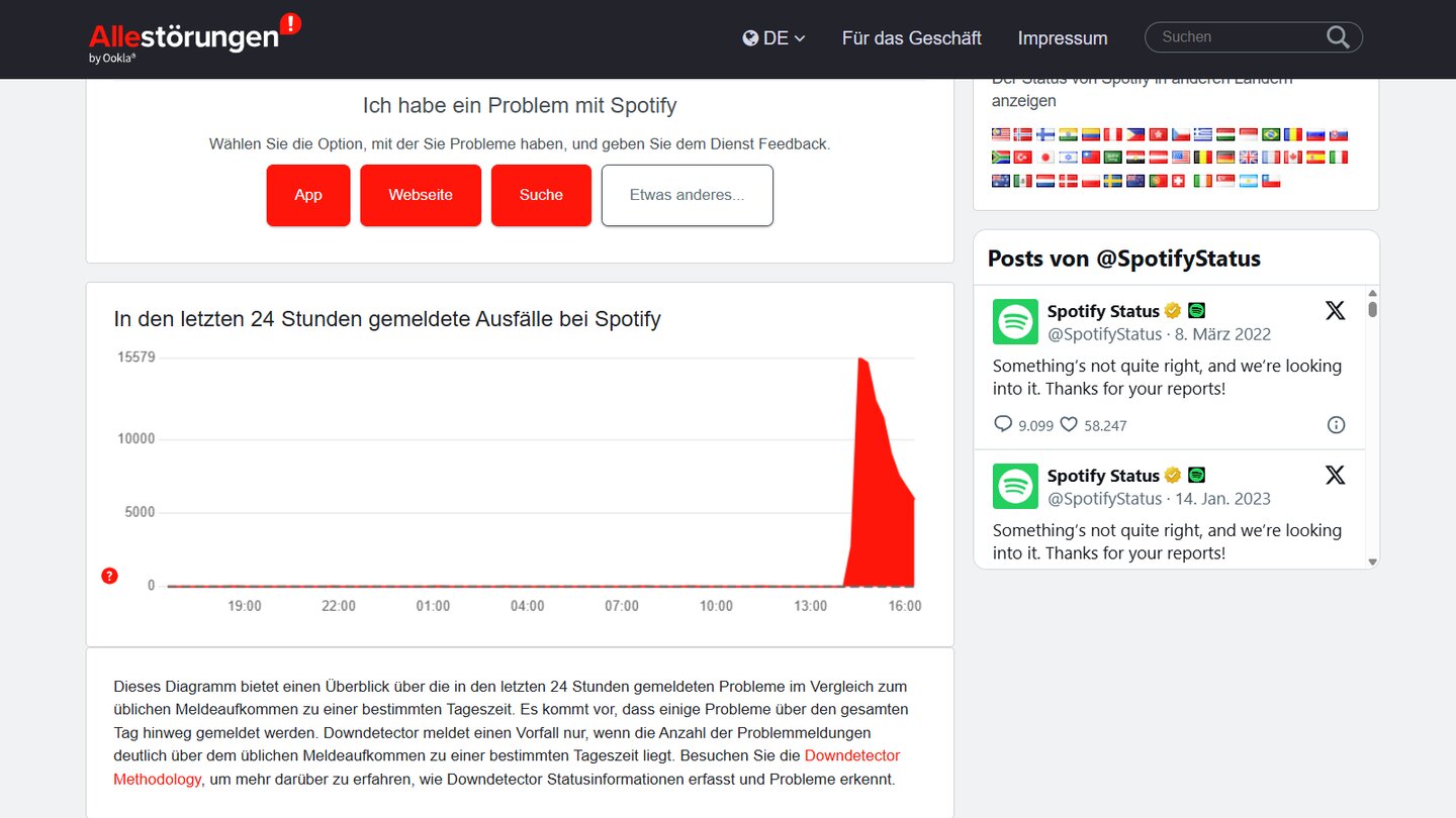 Unsere Versuche, spotify.com und die Windows-App aufzurufen, scheitern aktuell. Damit sind wir bei weitem nicht allein, wie unter anderem ein Bericht von TechRadar in den USA bestätigt.