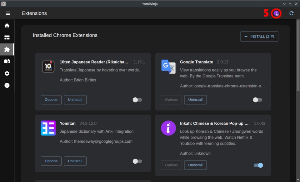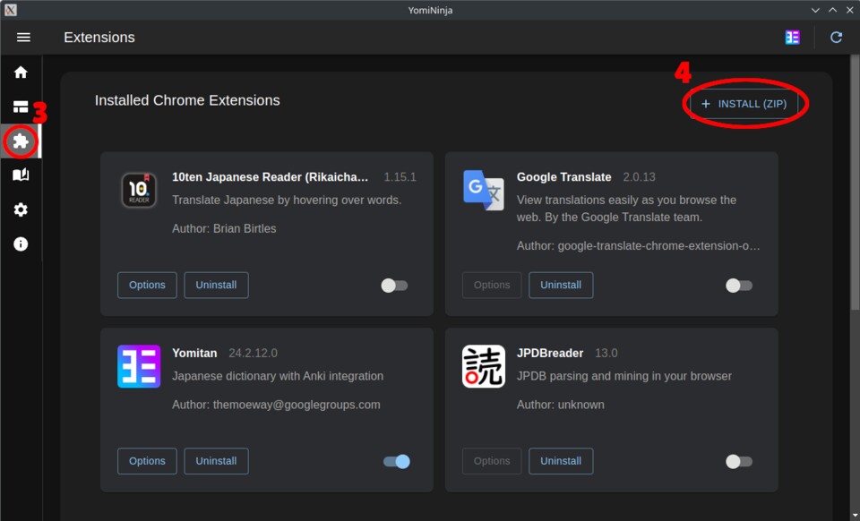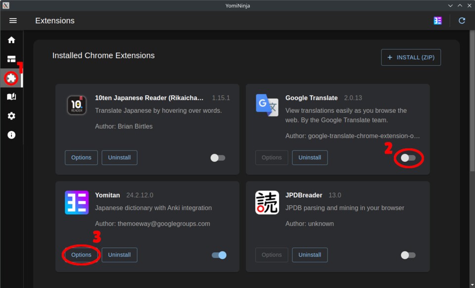 (1) in Yomininja am linken Bildschirmrand - Deaktiviert die Erweiterungen, die ihr nicht nutzen wollt (2)