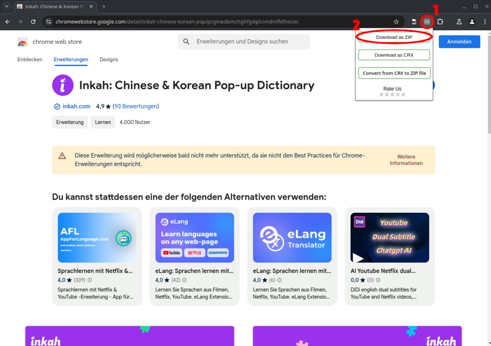 - Öffnet die Inkah-Seite im Chrome Web Store