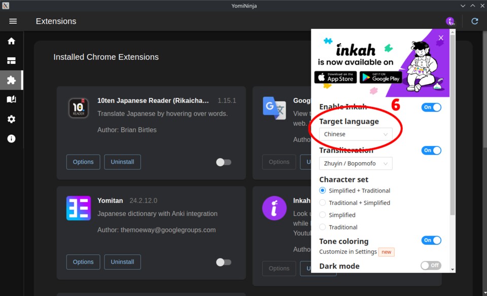 Wenn ihr Yomininja zum ersten Mal startet, müsst ihr es konfigurieren. Wollt ihr Google Translate verwenden, müsst ihr nichts weiter tun. Dasselbe gilt für Japanisch, wenn ihr englische Wörterbucheinträge haben wollt. Für deutsche Einträge hingegen müsst ihr die integrierte Yomitan-Erweiterung einrichten. Bei Koreanisch und Chinesisch müsst ihr noch die Chrome-Erweiterung Inkah installieren. So funktioniert's: