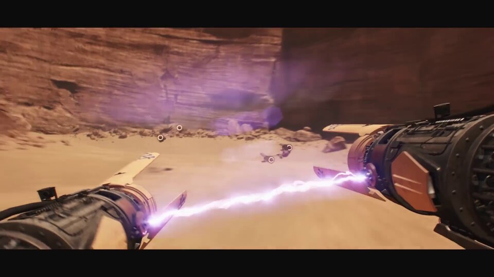 Viel ist momentan noch nicht fertig, doch zumindest die kultige Wüstenstrecke von Mos Espa hat der Entwickler schon vollständig nachgebaut. Auch was die unterschiedlichen Fahrzeuge angeht, ist die Auswahl noch sehr dünn. Bislang kann in dem Spiel lediglich Anakins selbstgebauter Podrenner ausgewählt werden.