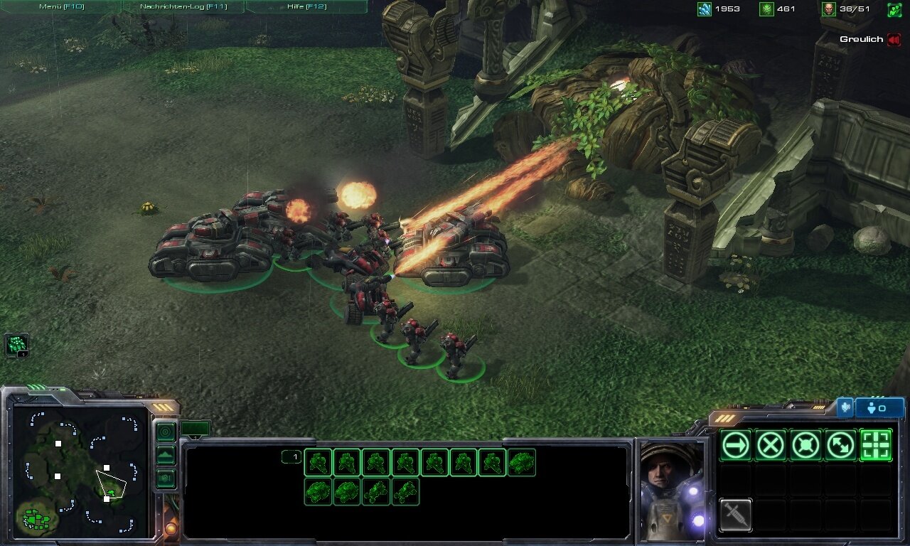 Das ist besonders nützlich, wenn Sie den Pylon-Teleport der Protoss verwenden. Denn jedes Warptor kann nur alle 30 Sekunden eine Einheit herbeirufen. Wer mehr Verstärkung braucht, gruppiert mehrere Warptore, klickt die gewünschten Einheiten im Baumenü an (oder drückt die zugehörigen Hotkeys) und platziert sie auf der Karte. Ohne die Gebäudegruppe müssten Sie hierfür ständig zur Basis zurückspringen. Ebenfalls hilfreich: Während Sie im ersten Starcraft nur zwölf Einheiten gleichzeitig befehligen durften, sind‘s in Starcraft 2 beliebig viele. Das hilft vor allem Gelegenheitsspielern, die sich nicht groß mit Mikromanagement befassen, sondern einfach Armeen aufeinander hetzen wollen.