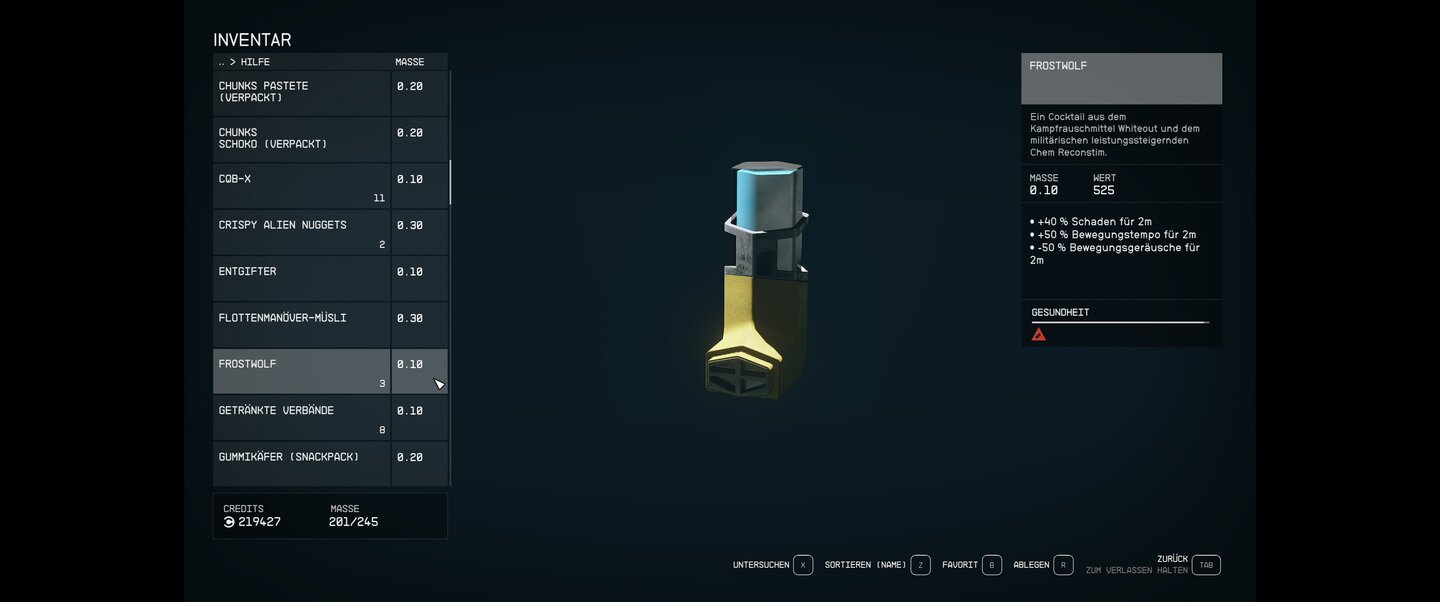 Ich habe diesen Fehler schon in Fallout begangen und wiederhole ihn in Starfield nicht: Statt die vielen im Spiel zu findenden Medikamente und Drogen zu verkaufen, nutze ich sie jetzt, wann immer es angebracht scheint. Werft am besten das meiste Essen aus dem Inventar, da sich Boni und Heilwirkung sowieso fast nie lohnen. Legt euch dagegen ein oder zwei nützliche Mittel auf den Schnellzugriff (Taste B).
